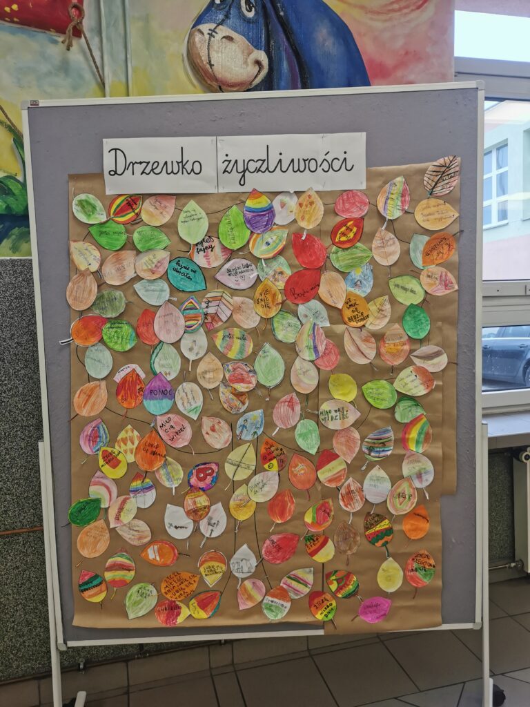 W naszej szkole obchodziliśmy Dzień Życzliwości, podczas którego uczniowie klas 1–3 mieli okazję okazać sobie nawzajem dużo dobra i uśmiechu. W szkolnym holu stanęło Drzewko Życzliwości, na którym dzieci zawieszały listki z miłymi słowami i pozdrowieniami.